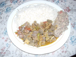 Curacao1 liber di Igra di baka of kabritu 1 tomati grandi korta chikitu 1 siboyo grandi korta chikitu 2 ténchi di konoflo korta chikitu 2 kuchara di manteka 1 lamoenchi Un tiki netumuskat Un tiki komino Un sneif di salu Sous pretu 1 glas di awa Ruku (enbes di katsup ya ku e ta hasie zoet)